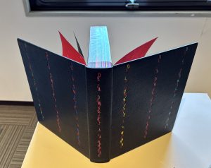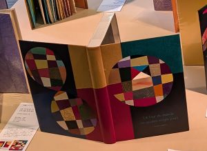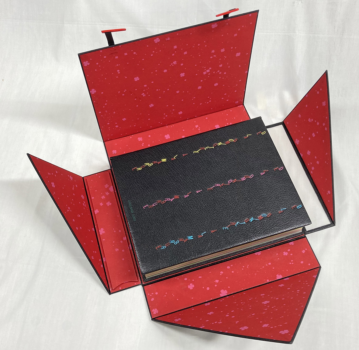 製本などに使われる装飾紙の実物入り歴史本、花ぎれを多色の絹糸で編み、三方小口も同色のアクリル絵の具で染めました 外から中身が見えるよう、天にガラス板を貼り、爪付きのつばくろ帙に収納