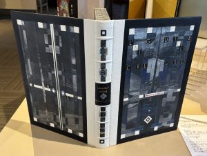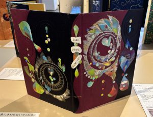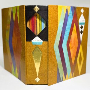 2022年、第16回フランス国際製本ビエンナーレ「LE LION」の出展作品 本文を9部の冊子に仕立てた後、プラ・ラポルテ製本としてまとめました。自作の描画を冊子、表紙の材料に用いています。背窓を開け、9冊子が見えるようにしました。