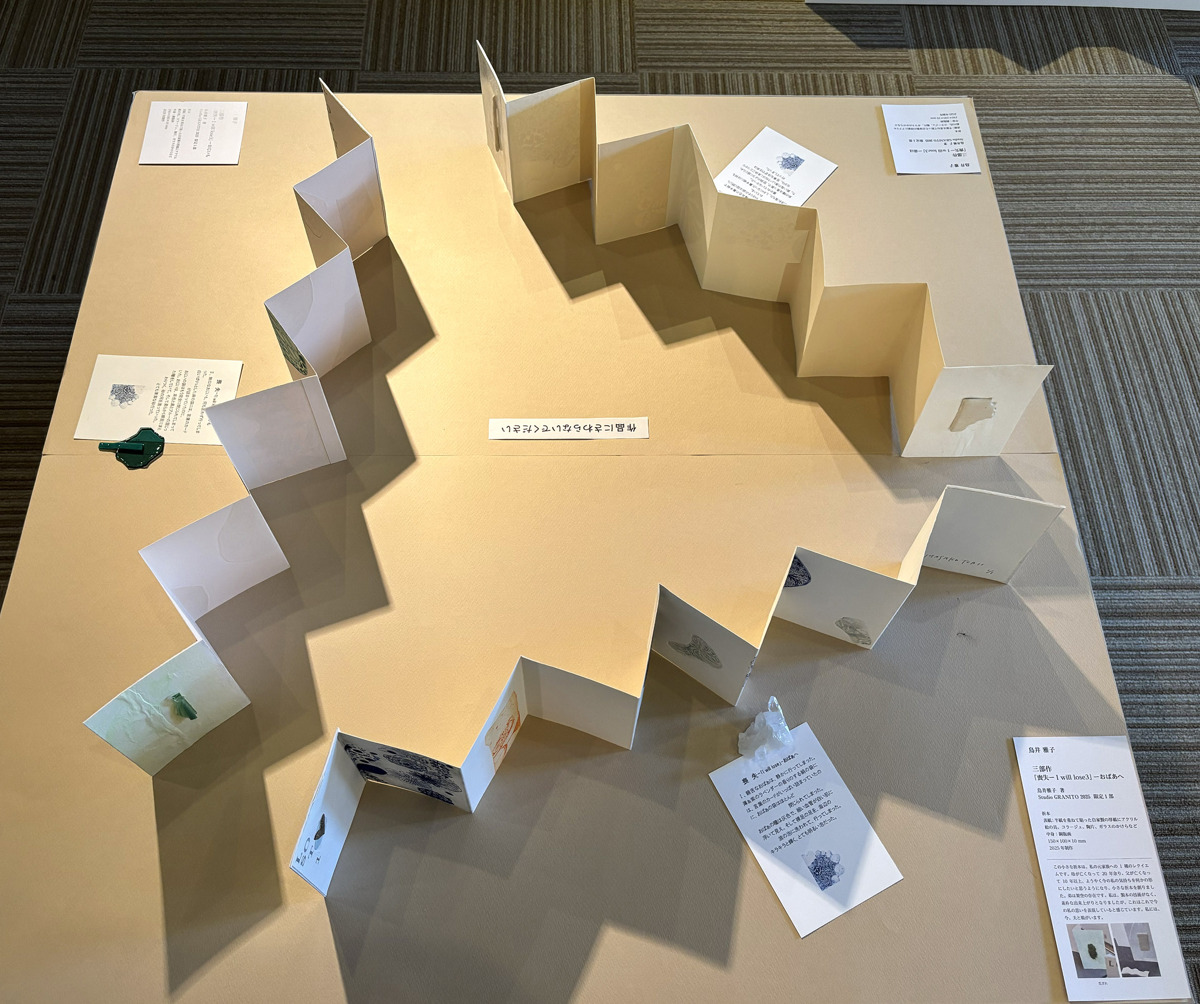 この小さな折本は、私の元家族への1種のレクイエムです。母が亡くなって20年余り、父が亡くなって10年以上、ようやく今の私の気持ちを何かの形にしたいと思うようになり、小さな折本を創りました。弟は架空の存在です。私は、製本の技術がなく、素朴な出来上がりとなりましたが、これはこれで今の私の思いを表現していると感じています。私には、今、夫と娘がいます。
