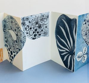 表紙は半紙を重ねて貼った自家製の厚紙にアクリル絵の具、コラージュ、陶片、ガラスのかけらなど、中身は銅版画
