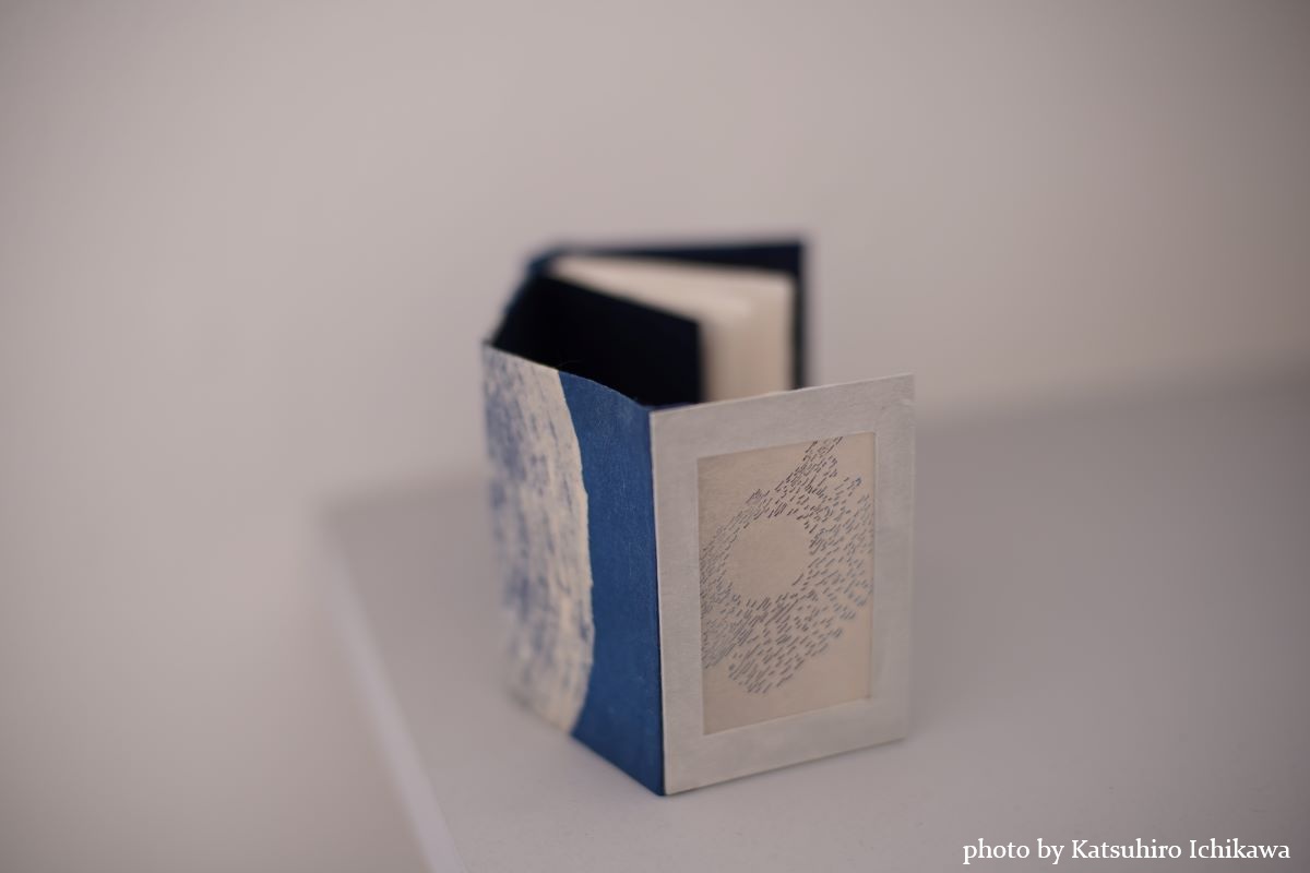 マーブル紙、雑草を漉いた紙、ガラスビーズなど、前からずっと好きで、今も変わらず好きな物。 そうした物を集めた、私らしい自然さの本。 砂浜で見つけた物のように、函をのぞき込んで、どうしてここはキラキラしているのだろう、どうしてここは流れてしまっているのだろう、といつまでも見ていて欲しい。